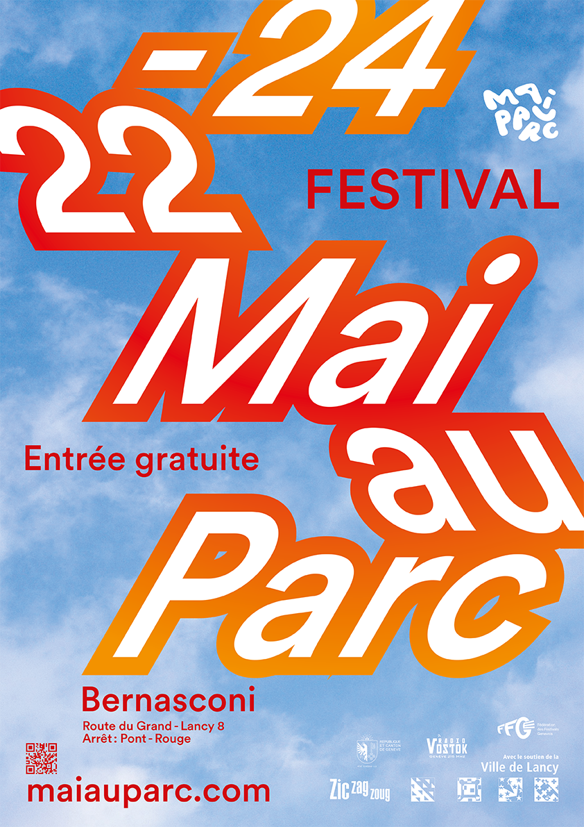 Mai au parc est un festival qui se produit pendant le mois de mai à Genève. Nous avons été mandaté pour recréer l'identité visuelle de l'édition 2026. Voici l'affiche ainsi que plusieurs déclinaisons pour le site web ou encore bâche ou réseaux sociaux.